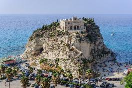 Κάτω από τους βράχους βρίσκεται μια στενή λωρίδα παραλίας, όπου η αντίθεση μεταξύ χρυσής άμμου και ζωηρού μπλε νερού είναι ιδιαίτερα εντυπωσιακή. Υψώνεται από αυτήν την ακτογραμμή, σε μια ξεχωριστή βραχώδη προεξοχή, η εμβληματική Santa Maria dell'Isola, μια κατασκευή που μοιάζει με μοναστήρι, περιτριγυρισμένη από βλάστηση και προσβάσιμη από μια απότομη σκάλα. Αποτελεί το οπτικό κεντρικό στοιχείο της Τρόπεα, γεφυρώνοντας τη γη και τη θάλασσα με τρόπο που δίνει την αίσθηση φυσικού και κατασκευασμένου.