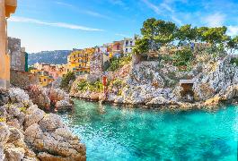 The shoreline is defined by rocky inlets, small harbors, and clear water that shifts in color with the light. Nearby, the seaside village of Porticello adds a lived-in maritime atmosphere, where boats line the docks and daily routines revolve around the sea. There is little sense of spectacle—just the steady rhythm of local life and the presence of the coastline as a constant backdrop.